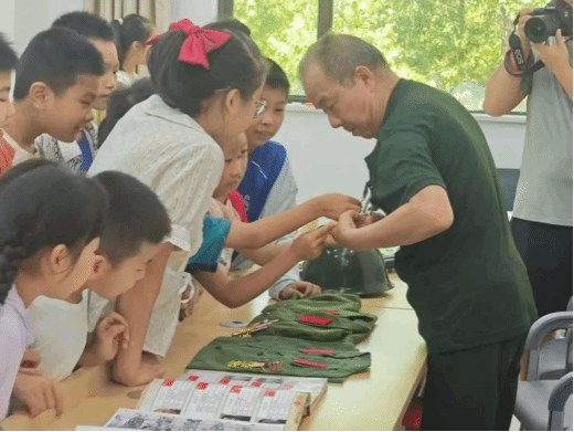 退伍军人爷爷带着岁月沉淀的厚重,缓缓讲述边疆保卫的热血过往。桌上陈列的“自卫还击保卫边疆胜利纪念”牌匾、军功章、旧军装等物件,成为故事生动注脚。孩子们围坐聆听,沉浸式感受那段激昂岁月。志愿服务队志愿者在旁辅助引导,让爱国教育自然融入,于无声处,在孩子们心底播撒崇尚英雄、守护家国的种子,让红色基因在新一代的聆听与感悟中持续传承、熠熠生辉。