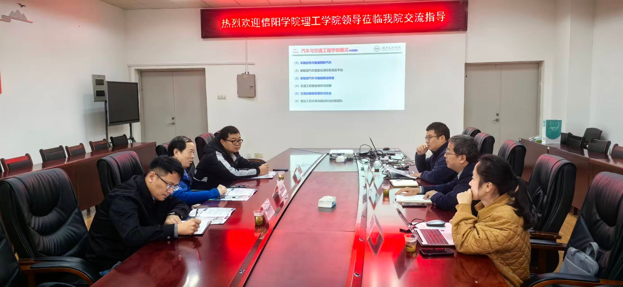 (交通学院 通讯员 陈运星)10月24日,信阳学院理工学院院长肖生发一行来我院访问交流。交通学院教授周海鹰、党委委员刘祯、车辆工程专业负责人陈运星参加交流座谈。会议由交通学院党委书记詹玉刚主持。