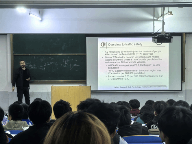 (交通学院通讯员 陈运星)近日,我院特邀土耳其中东技术大学心理学系安全研究所的知名教授TÜRKER ÖZKAN,为车辆工程专业本科新生带来了一场内容丰富、视角前沿的《导论课》。聚焦于交通安全领域,系统性地讲解了从全球现状到研究方法的全链条知识。